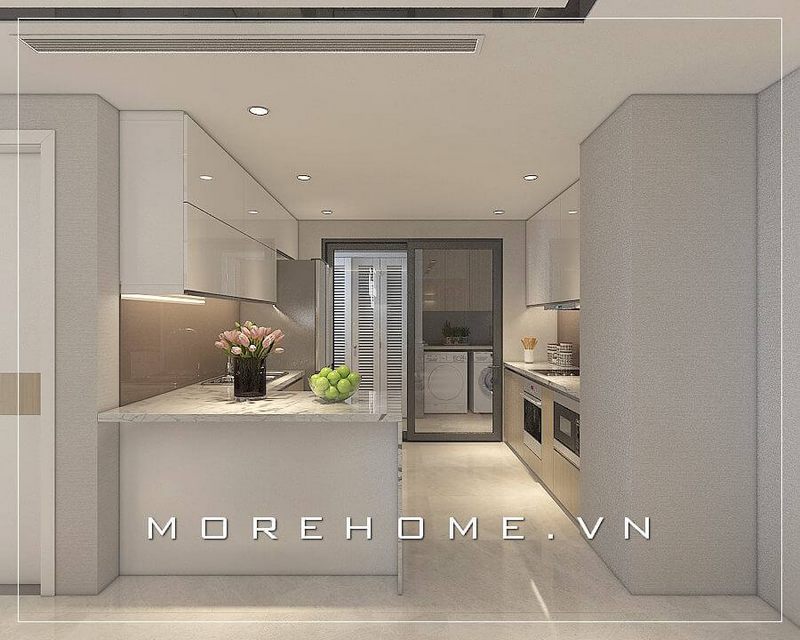 Không gian phòng bếp chung cư được thiết kế hiện đại, nội thất tone màu trắng thể hiện sự tinh tế, trẻ trung và sang trọng