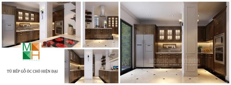 Tủ bếp gỗ óc chó hiện đại được sản xuất bởi nội thất Morehome, phá cách với thiết kế cánh pano đơn giản, bắt mắt.