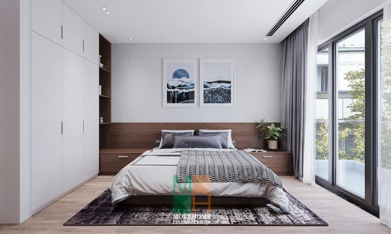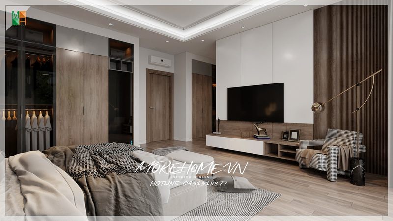 Nội thất phòng ngủ gỗ công nghiệp với gam màu trắng kết hợp với màu sắc trung tính, chủ đạo là các khe thẳng ở tường đã rất thành công khi đem đến cảm giác mạnh mẽ, hiện đại