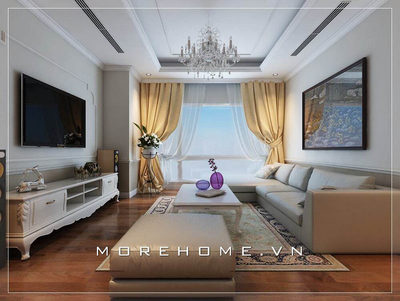 Cách trang trí phòng khách rất phù hợp và khoa học sử dụng mẫu kệ tivi tân cổ điển sắc trắng chủ đạo rất tinh tế tôn vẻ tiện nghi cho căn phòng ngủ.