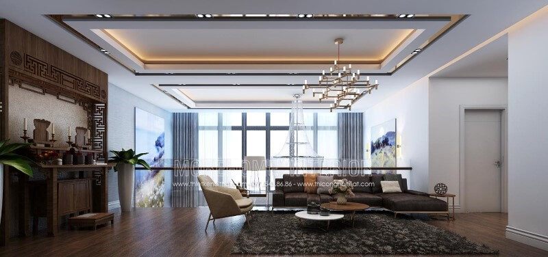 Thiết kế phòng khách sang trọng, hiện đại với đèn chùm kiểu cách, kết hợp ánh sáng tự nhiên từ hệ thống cửa kính ban công cánh lùa, mang đến không gian vô cùng thoáng đãng