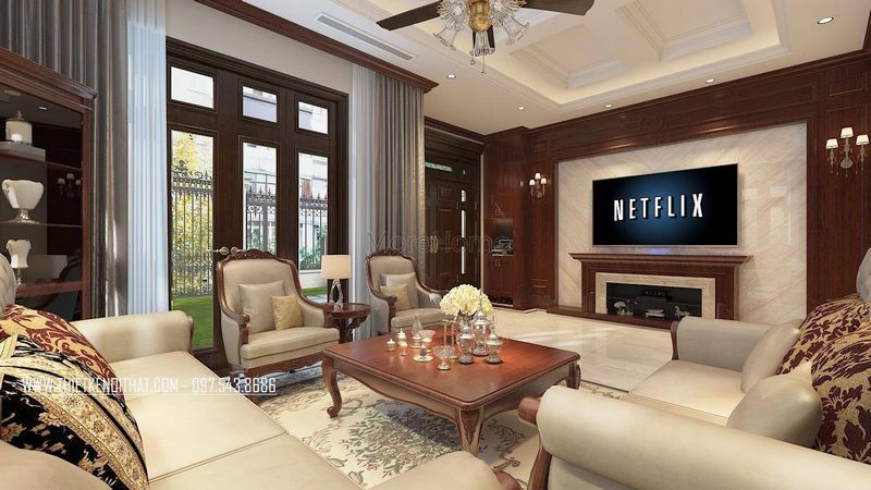 Trang trí nội thất phòng khách biệt thự tân cổ điển nhẹ nhàng, không quá cầu kì vào từng chi tiết nhỏ, tạo nên không gian sang chảnh và thoáng đãng hơn