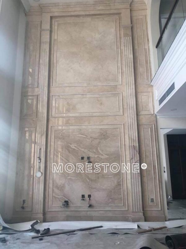Ý tưởng thiết kế đá ốp tường cho phòng khách đẹp sang trọng từ sự sáng bóng, bền bỉ của chất liệu và tinh tế từ nhiều đường vân mây uốn lượn được Morestone thi công, hoàn thiện.